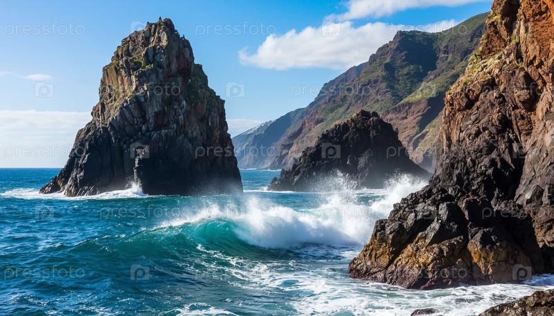 Жестокий морской пейзаж с высокими скалами на берегу