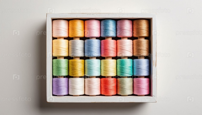 Катушки пастельной швейной нити в белой деревянной коробке