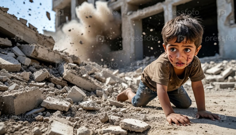 Арабский мальчик ползет по городу, разрушенному взрывом.Военный конфликт на Ближнем Востоке