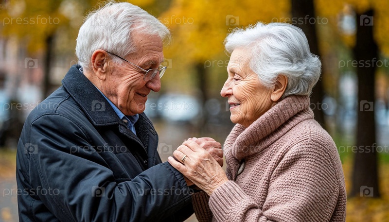 Пожилая пара держится за руки среди созданного искусственным интеллектом осеннего парка