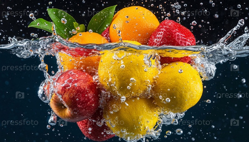 Плоды брызгут водой на темном фоне