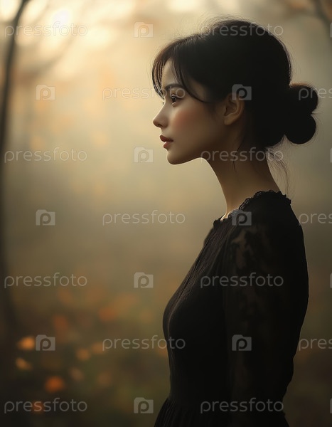 Женщина с булочкой в темном платье, стоящая в туманном лесу, таинственная