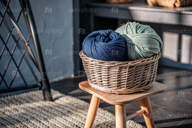 Шары из пряжи в плетеной корзине на деревянном стуле. Игла, текстиль, вязание. Зимний сезон, малый бизнес, ручная одежда