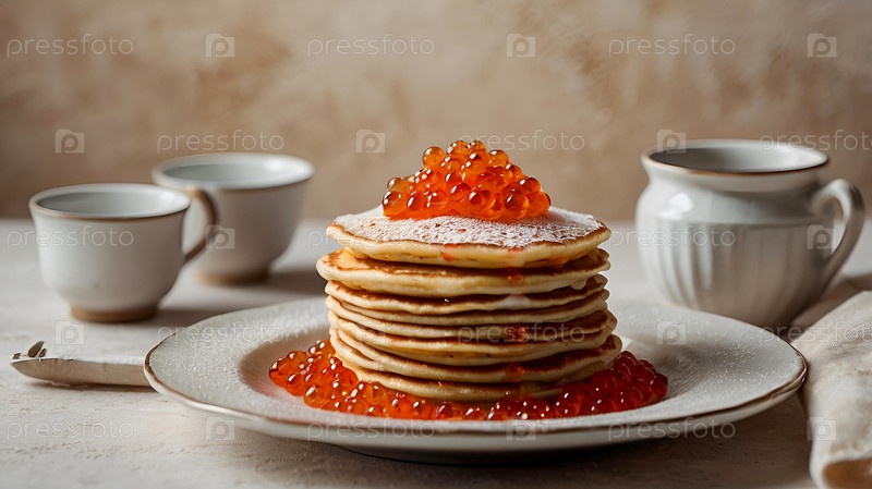 русские традиции. российский праздник Масленица. натюрморт с кучей блинов и красной икры на светло-бежевом фоне
