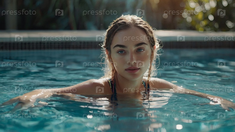 Близко. красивая молодая женщина в бирюзовом бассейне. концепция здорового образа жизни, отдых, расслабление, туризм, косметические спа-процедуры в курорте красота, гордость