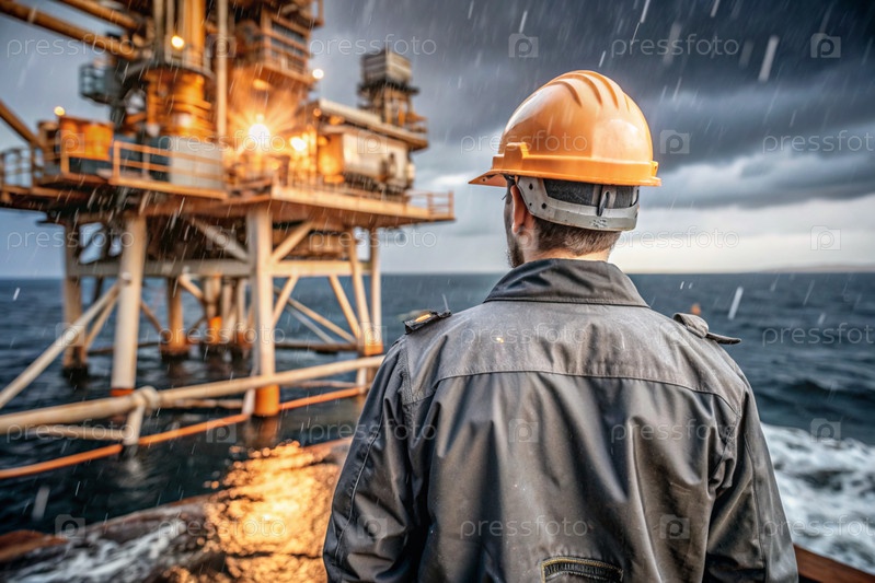 Добыча нефти. Нефтяные скважины и человек в рабочей одежде и строительном шлеме. Нефтяная платформа и промышленное оборудование. Тяжелые условия труда