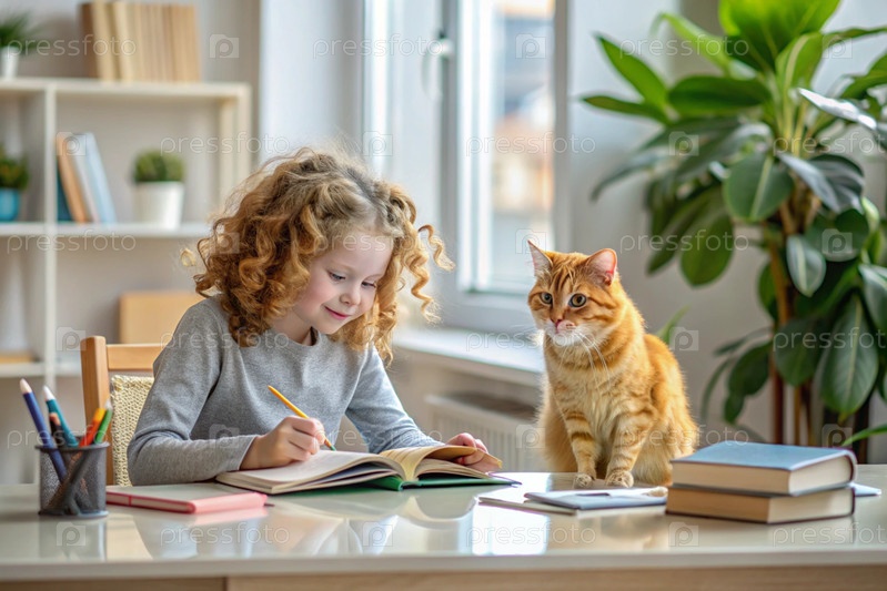 Образование и обучение. маленькая кудрявая девочка делает домашнее задание. ученик выполняет школьное дома. рядом со мной сидит рыжеволосая кошка