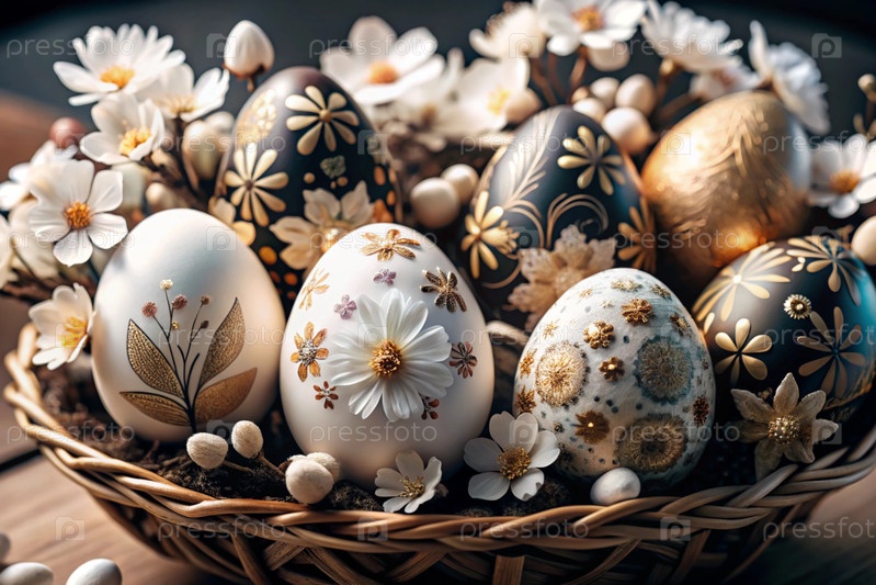 Пасхальный баннер. Концепция яркого пасхального праздника. Необычное деликатное пасхальное яйцо с нежными белыми цветами