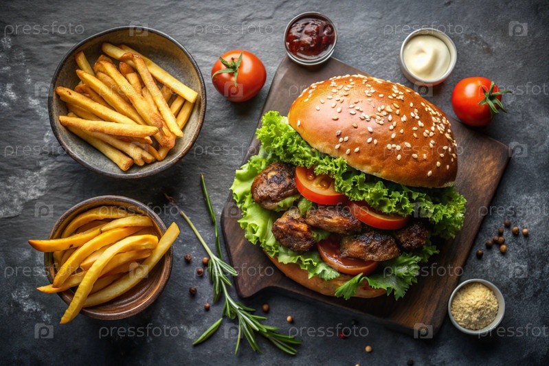 Фри, гамбургеры, свиные ребра на стильной доске на деревянном фоне. жареный картофель. концепция фаст-фуда, нездоровой еды и приготовления быстрого питания
