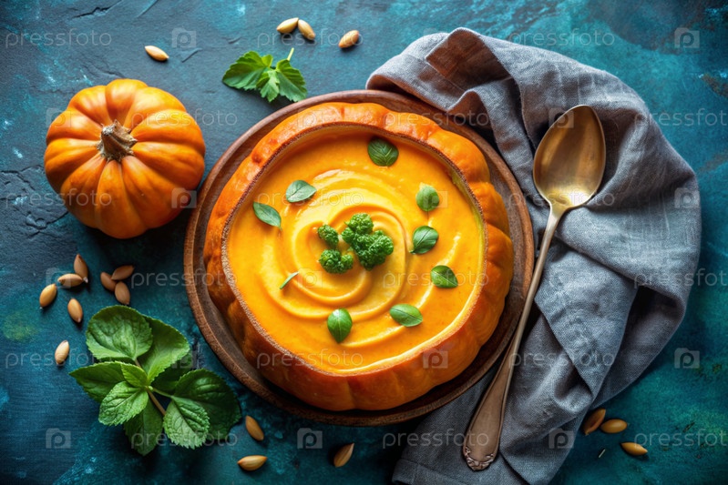 Традиционный мягкий тыквенный кремовый суп с сливками и семьями тыквы на бирюзовом бетонном фоне