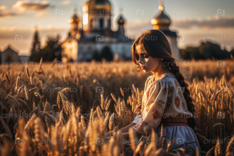 Молодая девушка в льняном платье на фоне поля спелых золотых пшениц и православной церкви при закате солнца
