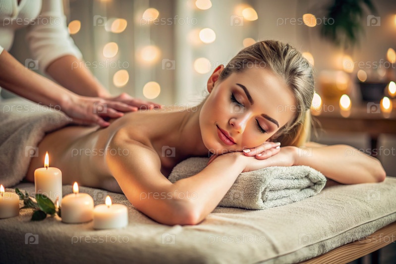 Баннер для профессиональных массажных салонов.Молодая, красивая блондинка наслаждается массажем в современном спа при свечах.Освобождение и гармония, уход за телом