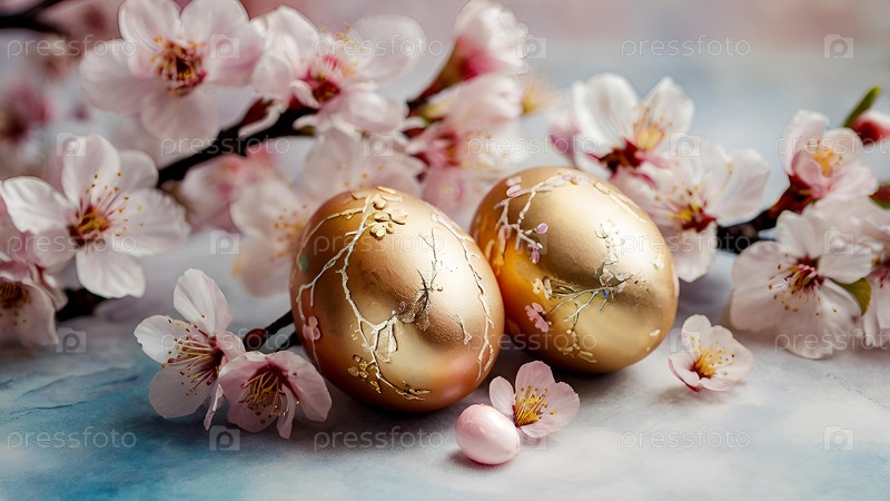 Нежные пасхальные яйца и вишневые ветви цветут на пастельном акварельном фоне с нежными полосками