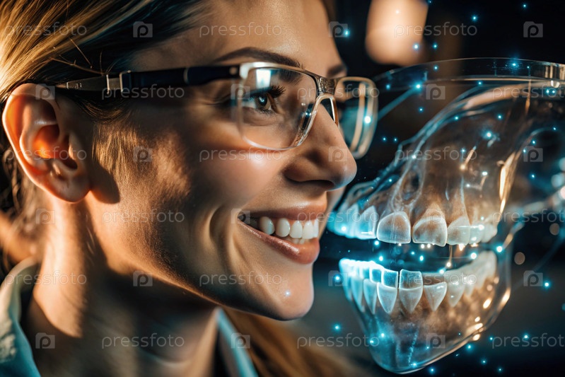Новые технологии цифрового искусственного интеллекта в зубных протезах. Имплантаты. Женщина-стоматолог с идеальной улыбкой и цифровая графика на виртуальном экране. Концепция стоматологического здоровья и ухода за зубами