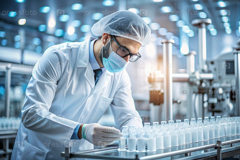 Производство лекарств: фармацевт тестирует медицинские флаконы на автоматическом трубопроводе фармацевтической производственной линии с использованием искусственного интеллекта