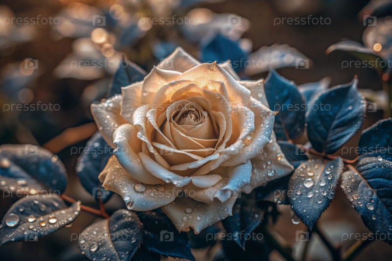 Кремовая роза красивого цвета кофе или шампанского, покрытая росой на рассвете. Красивое солнечное сияние. Фон изображения выполнен в зеленых и бежевых тонах. Естественный, экологически чистый естественный фон