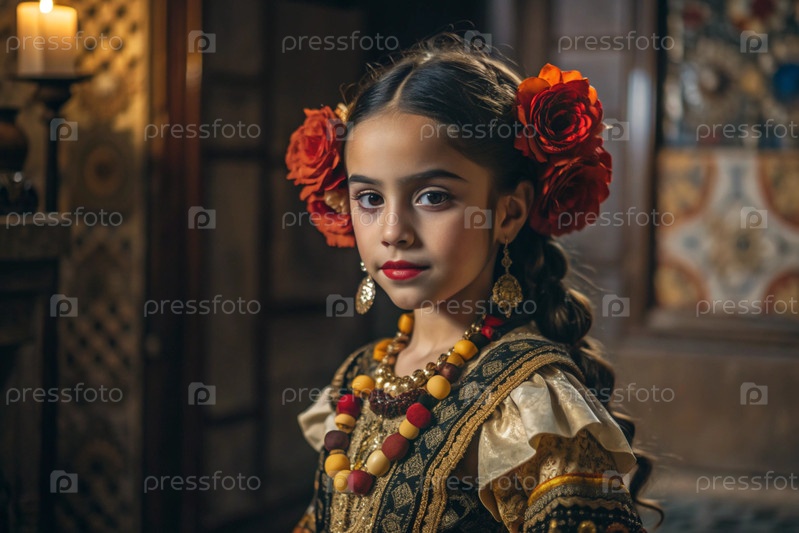 Испанская девушка в традиционном испанском национальном костюме. Перед быком. Бикоборство. Портрет символизирует традиции и культуру народа Испании