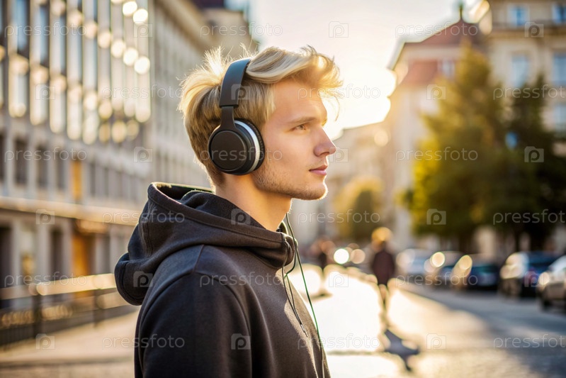 Музыкальный любитель. молодой красавчик в черной толстовке слушает музыку с наушниками на вечерней улице города при закате солнца. мир, гармония, отдых и расслабление