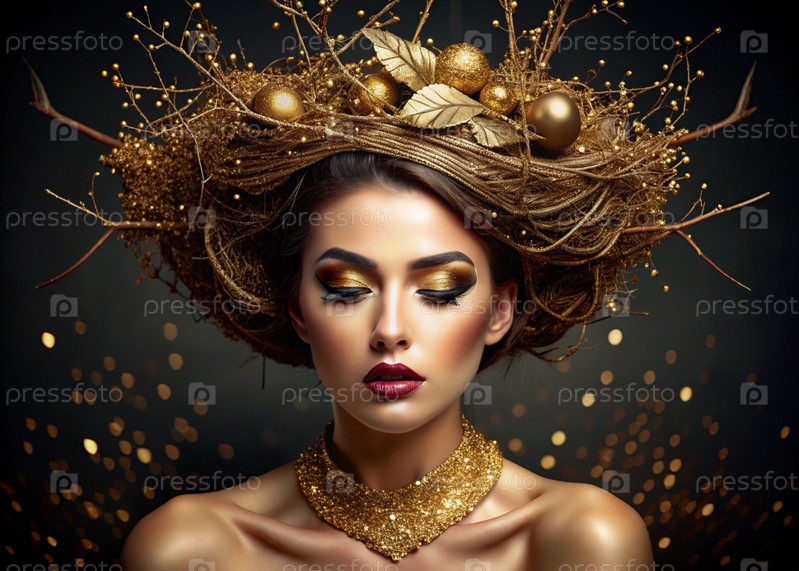 Творческий баннер для салона красоты в черно-золотых тонах. Профессиональный макияжный художник, стилист и парикмахер. Красивая женщина с вечерним гримом и золотым гнездом и яйцами на голове. Индустрия красоты