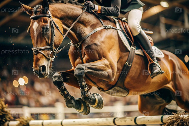 Близкий план олимпийской лошади и всадника, перепрыгивающих через препятствие на открытой арене - это конная езда