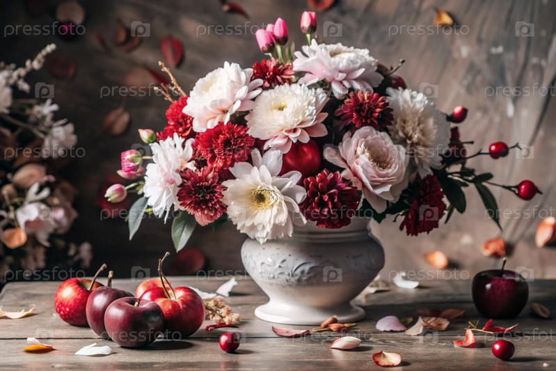 Красочное лето, осенний букет цветов различных красных, розовых, белых оттенков в вазе и спелые красные яблоки на столе