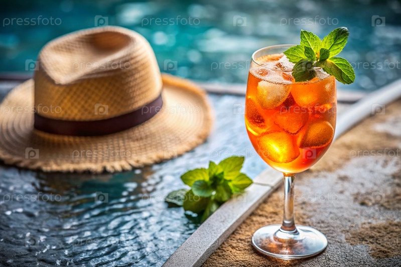 Стакан вкусного апельсинового коктейля Aperol на фоне бассейна.Алкогольный коктейль сочных фруктов с апельсином, кубиками льда и мятой
