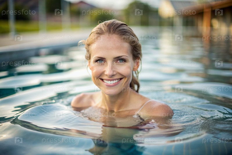Красивая молодая женщина плавает и тренируется в отопительном бассейне, счастливая и улыбающаяся девушка