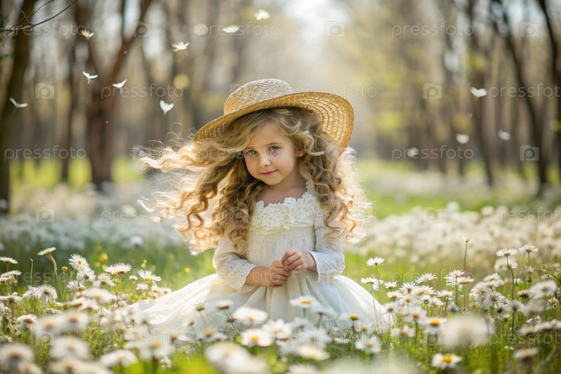 Всероссийский день семьи, любви и верности Красивая маленькая кудрявая девочка в соломенной шляпе с букетом ромашки на фоне поля. День святого Валентина Петра и Февронии