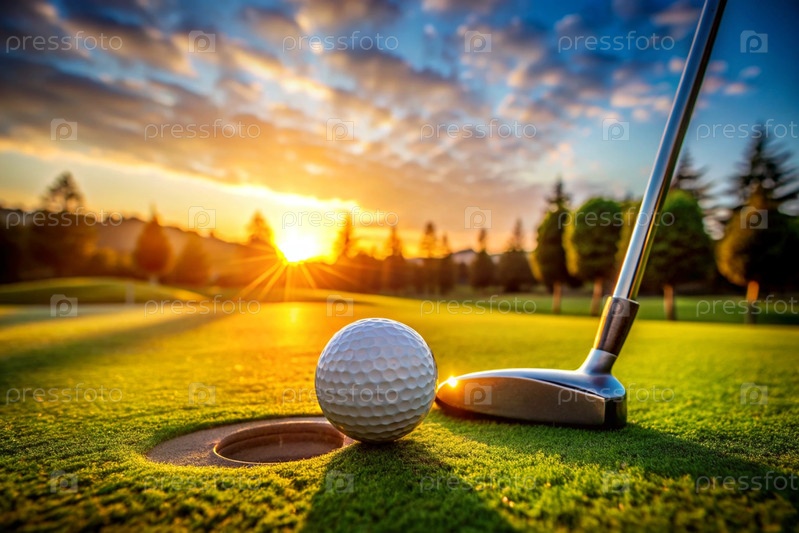 Баннер. белый мяч и металлическая клюшка для гольфа лежат на газоне в руках мужчины среди заката солнца. реклама матча по гольфу в кантри-клубе. свободное место для текста
