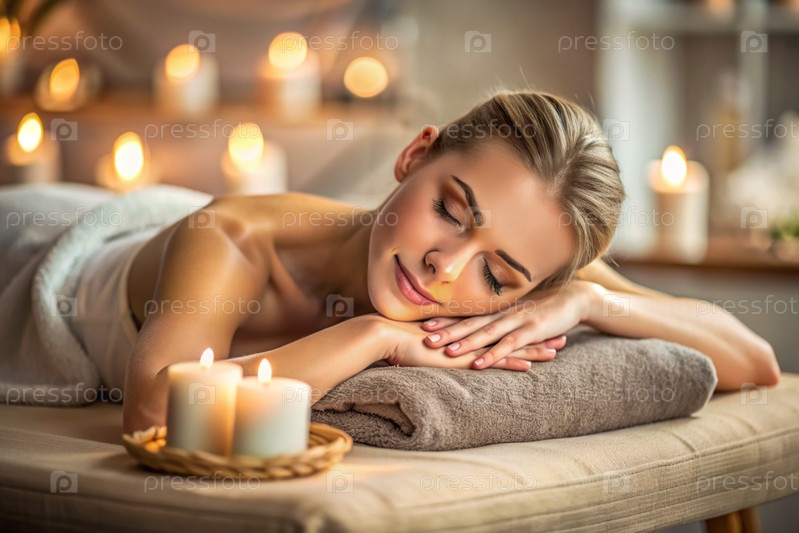 Баннер для профессиональных массажных салонов.Молодая, красивая блондинка наслаждается массажем в современном спа при свечах.Освобождение и гармония, уход за телом