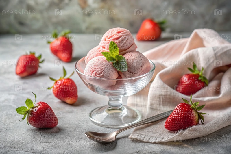 сладкий десерт. любовь к мороженому. клубничные шарики с мороженым в стеклянной таре и свежие ягоды. баннер, реклама