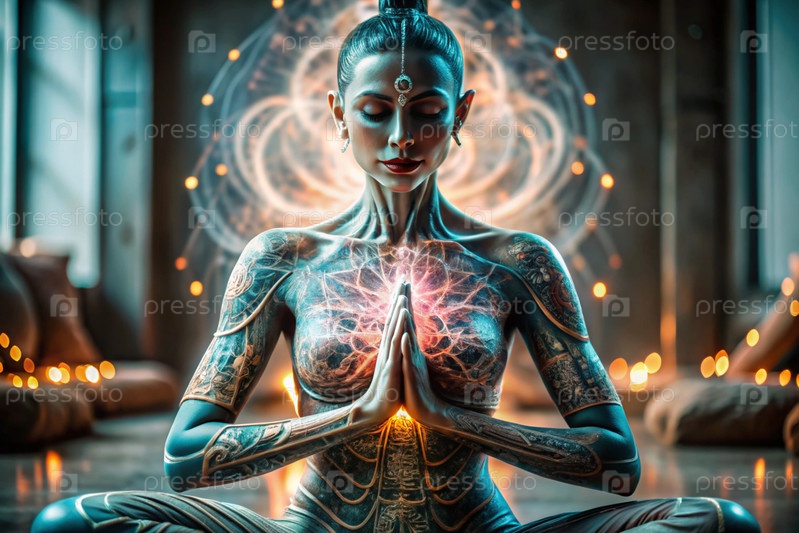 Концепция эзотерической духовной медитации, женщина в позе лотоса.Человеческая медитация, духовность и активация чакр, мистический дух