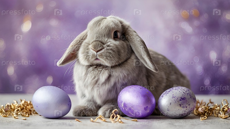 Нежные пасхальные яйца, серый кролик и фиолетовые цветы гиацинта на пастельном акварельном фоне с нежными венами