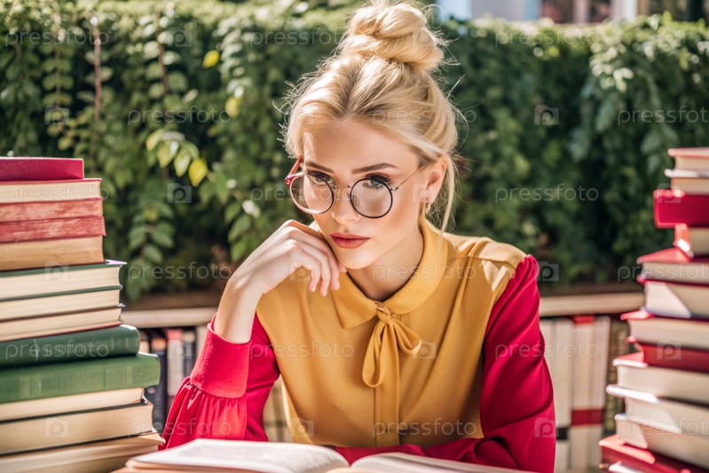Чтение, подготовка к экзаменам. Прием в колледж. Молодая девушка с очками среди многих книг во внутренней части гостиной, сидящая дома под естественным светом