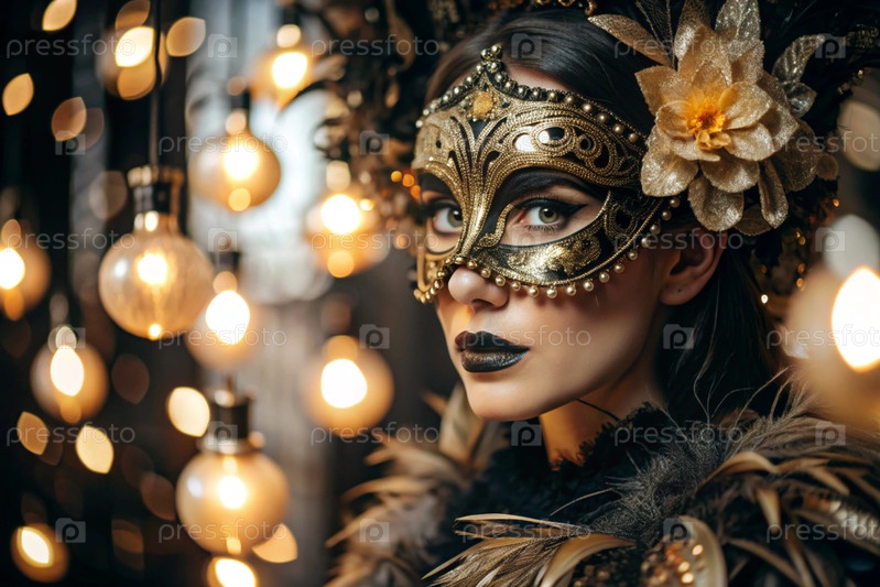 Карнавал Венеции.Закрытие женщины в украшенной карнавальной маске.Яркие цвета передают атмосферу празднования и роскоши