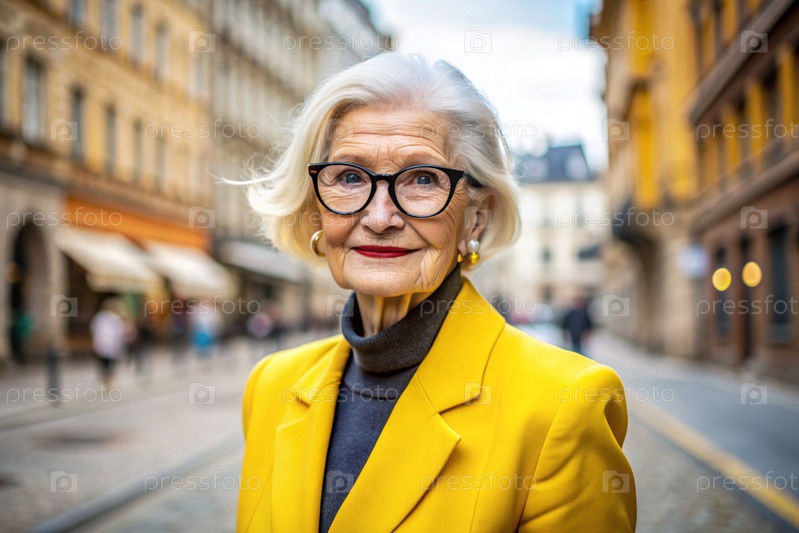 Портрет стильной, модной пожилой женщины, пенсионерки 70 лет на улице города с очками и ярко-желтым костюмом