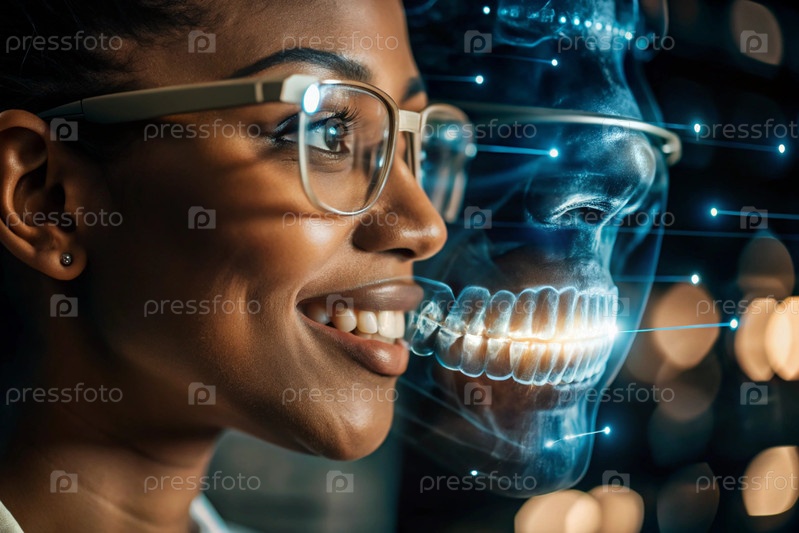 Новые технологии цифрового искусственного интеллекта в зубных протезах. Имплантаты. Чернокожая женщина-стоматолог с идеальной улыбкой и цифровой стоматологической графикой на виртуальном экране. Концепция здоровья зубов и ухода за зубами