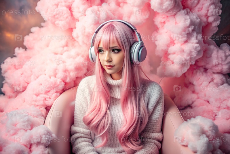 Молодая красивая японская девушка с розовыми волосами в аниме слушает музыку на беспроводных наушниках в розовых облаках