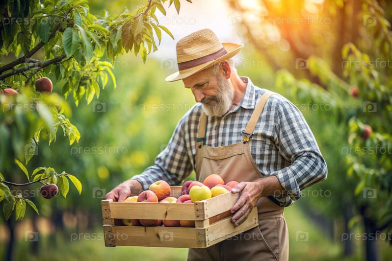 Сельскохозяйственная промышленность. Деревянный ящик с персиками в руках фермера-мужчины. Садовник собирает богатый урожай. Ближе, солнечный свет. Осенний урожай фруктов