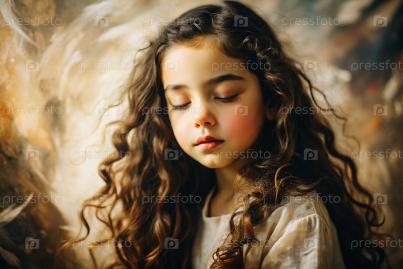 Портрет красивой маленькой брюнетки с длинными волнистыми волосами и вдумчивым взглядом.Волосы развиваются и создают ощущение легкости и естественности