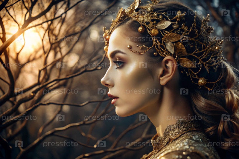 Творческий баннер для салона красоты в черно-золотом цвете. Красивая женщина, окруженная лесом с макияжем и волосами. Золотые ветви дерева в волосах. Индустрия красоты