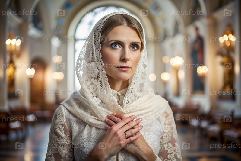 Портрет красивой молодой женщины с платками в православной церкви.Девушка молится в церкви среди икон