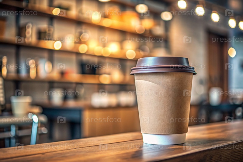 Экологически чистый бумажный стакан для одноразового использования с кофе на столе против размытого фона кофейни