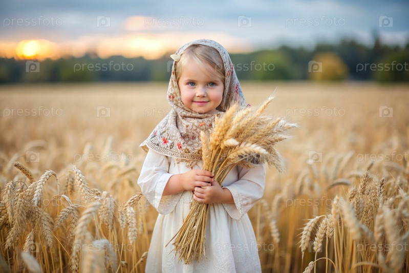 Русская девушка в белом платье и русском шале держит золотые колосья пшеницы на фоне созревающего поля. Концепция посадки и сбора богатого урожая. Сельский пейзаж