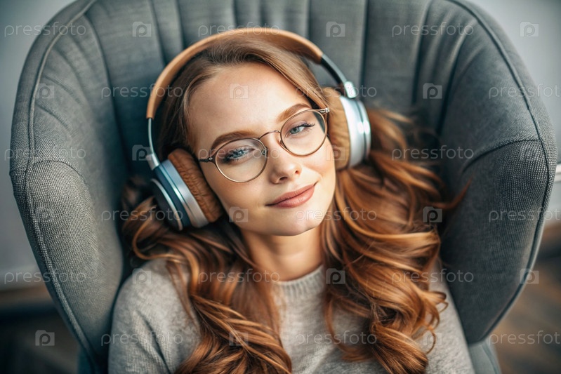 Молодая красивая рыжеволосая женщина с веснушками слушает музыку в больших беспроводных наушниках дома на стуле в гостиной