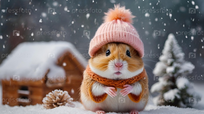 Забавный хомяк с большими щеками, одетый в уютную мягкую розовую тёплую одежду, шляпу и шарф на зимнюю тематику