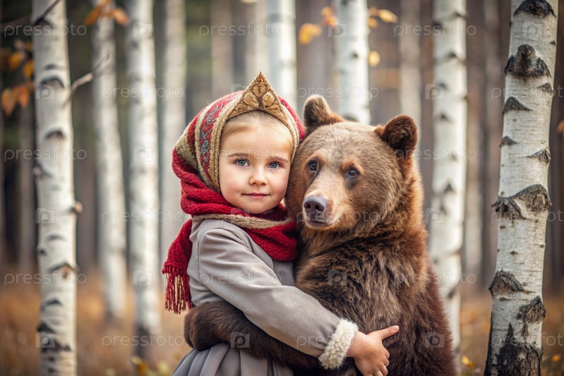 Красивая маленькая девочка в русской народной одежде и с платками на голове в березовой роще с живым медведем Русский фольклор, славянская мифология