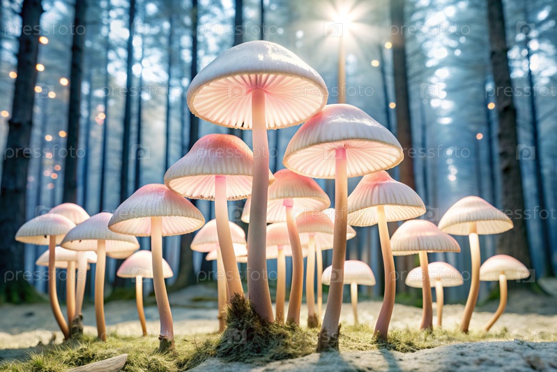Ядовитые грибы. Жабы. Галлюциногенные грибы. Светящиеся грибы. Изображение для иллюстрации тем, связанных с природой, фантазией, сказками и магией