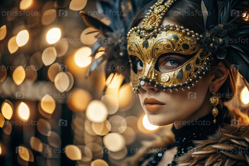 Карнавал Венеции.Закрытие женщины в украшенной карнавальной маске.Яркие цвета передают атмосферу празднования и роскоши