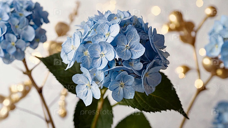 Голубые хортензии - это летние ароматные цветы. Красивый цветочный фон с красивым эффектом боке. Нежная голубая гортензия цветёт на белом акварельном фоне со золотыми венами
